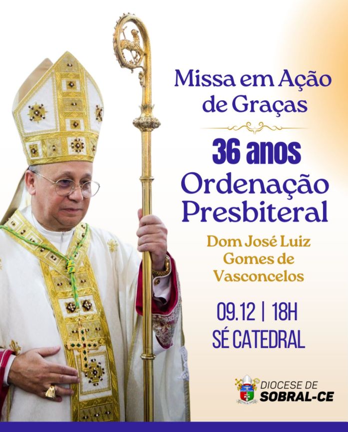 Com alegria, a Diocese de Sobral convida a todos para a Solene Celebração Eucarística em Ação de Graças pelos 36 anos de Ordenação Presbiteral de Dom José Luiz Gomes de Vasconcelos.