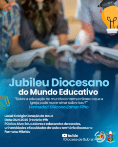 Nos dias 24 e 28 de novembro, a Diocese de Sobral vive um período marcado por fé, reflexão e compromisso comunitário. O Jubileu do Mundo Educativo reúne educadores, estudantes e fiéis em duas atividades que convidam todos a retomar o sentido da esperança e da missão, dentro do espírito jubilar que prepara a Igreja para 2025.